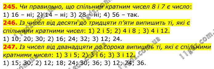 245. Чи правильно, що спільним кратним чисел 8 і 7 є число: 1) 16 – ні; 2) 14 – ні; 3) 28 – ні; 4) 56 – так. 246. Із чисел від десяти до тридцяти п’яти випишить ті, які є спільними кратними чисел: 1) 2 і 5; 2) 4 і 8 ; 3) 4 і 12. 1) 10; 20; З0; 2) 16; 24; 32; 3) 12; 24. 247. Із чисел від дванадцяти до сорока випишіть ті, які є спільними кратними чисел: 1) 3 і 5; 2) 3 і 6; 3) 3 і 12. 1) 15; З0; 2) 12; 18; 24; З0; 36; 3) 12; 24; 36.