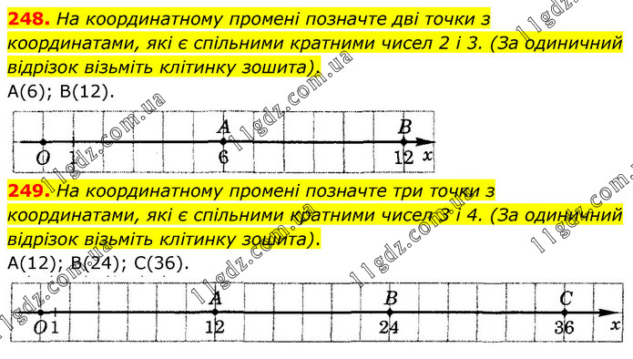 248. На координатному промені позначте дві точки з координатами, які є спільними кратними чисел 2 і 3. (За одиничний відрізок візьміть клітинку зошита). А(6); В(12). 249. На координатному промені позначте три точки з координатами, які є спільними кратними чисел 3 і 4. (За одиничний відрізок візьміть клітинку зошита). А(12); В(24); С(36).