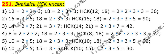 Знайдіть HCK чисел: 1) 12 = 2 ∙ 2 ∙ 3; 18 = 2 ∙ 3 ∙ 3; НСК(12; 18) = 2 ∙ 2 ∙ 3 ∙ 3 = 36; 2) 15 = 3 ∙ 5; 18 = 2 ∙ 3 ∙ 3; НСК(15; 18) = 2 ∙ 3 ∙ 3 ∙ 5 = 90; 3) 14 = 2 ∙ 7; 21 = 3 ∙ 7; НСК(14; 21) = 2 ∙ 3 ∙ 7 = 42. 4) 8 = 2 ∙ 2 ∙ 2; 18 = 2 ∙ 3 ∙ 3; НСК(8; 18) = 2 ∙ 2 ∙ 2 ∙ 3 ∙ 3 = 72; 5) 10 = 2 ∙ 5; 18 = 2 ∙ 3 ∙ 3; НСК(10; 18) = 2 ∙ 3 ∙ 3 ∙ 5 = 90; 6) 10 = 2 ∙ 5; 15 = 3 ∙ 5; НСК(10; 15) = 2 ∙ 3 ∙ 5 = 30.