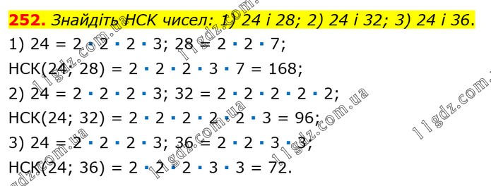 Знайдіть HCK чисел: 1) 24 і 28; 2) 24 і 32; 3) 24 і 36. 1) 24 = 2 ∙ 2 ∙ 2 ∙ 3; 28 = 2 ∙ 2 ∙ 7; НСК(24; 28) = 2 ∙ 2 ∙ 2 ∙ 3 ∙ 7 = 168; 2) 24 = 2 ∙ 2 ∙ 2 ∙ 3; 32 = 2 ∙ 2 ∙ 2 ∙ 2 ∙ 2; НСК(24; 32) = 2 ∙ 2 ∙ 2 ∙ 2 ∙ 2 ∙ 3 = 96; 3) 24 = 2 ∙ 2 ∙ 2 ∙ 3; 36 = 2 ∙ 2 ∙ 3 ∙ 3; НСК(24; 36) = 2 ∙ 2 ∙ 2 ∙ 3 ∙ 3 = 72.