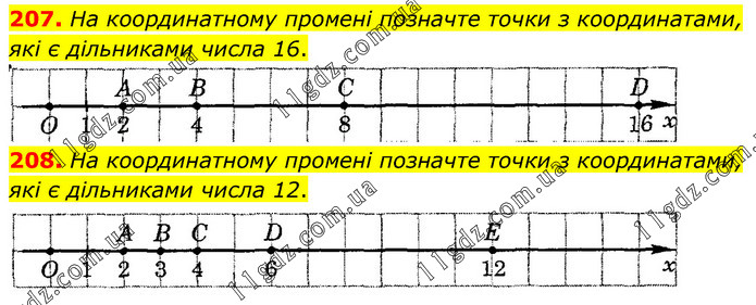 207. На координатному промені позначте точки з координатами, які є дільниками числа 16. 208. На координатному промені позначте точки з координатами, які є дільниками числа 12.