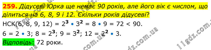 Дідусеві Юрка ще немає 90 років, але його вік є числом, що ділиться на 6, 8, 9 і 12. Скільки років дідусеві? НСК(6, 8, 9, 12) = 23 • З2 = 8 • 9 = 72 < 90. 6 = 2 • 3; 8 = 23; 9 = З2; 12 = 22 • 3. Відповідь: 72 роки.