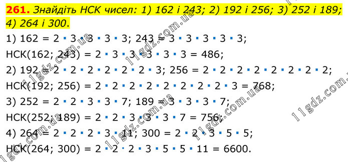 Знайдіть HCK чисел: 1) 162 і 243; 2) 192 і 256; 3) 252 і 189; 4) 264 і 300. 1) 162 = 2 ∙ 3 ∙ 3 ∙ 3 ∙ 3; 243 = 3 ∙ 3 ∙ 3 ∙ 3 ∙ 3; НСК(162; 243) = 2 ∙ 3 ∙ 3 ∙ 3 ∙ 3 ∙ 3 = 486; 2) 192 = 2 ∙ 2 ∙ 2 ∙ 2 ∙ 2 ∙ 2 ∙ 3; 256 = 2 ∙ 2 ∙ 2 ∙ 2 ∙ 2 ∙ 2 ∙ 2 ∙ 2; НСК(192; 256) = 2 ∙ 2 ∙ 2 ∙ 2 ∙ 2 ∙ 2 ∙ 2 ∙ 2 ∙ 3 = 768; 3) 252 = 2 ∙ 2 ∙ 3 ∙ 3 ∙ 7; 189 = 3 ∙ 3 ∙ 3 ∙ 7; НСК(252; 189) = 2 ∙ 2 ∙ 3 ∙ 3 ∙ 3 ∙ 7 = 756; 4) 264 = 2 ∙ 2 ∙ 2 ∙ 3 ∙ 11; 300 = 2 ∙ 2 ∙ 3 ∙ 5 ∙ 5; НСК(264; 300) = 2 ∙ 2 ∙ 2 ∙ 3 ∙ 5 ∙ 5 ∙ 11 = 6600.