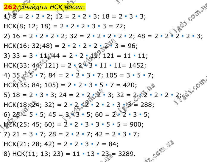 Знайдіть HCK чисел: 1) 8 = 2 ∙ 2 ∙ 2; 12 = 2 ∙ 2 ∙ 3; 18 = 2 ∙ 3 ∙ 3; НСК(8; 12; 18) = 2 ∙ 2 ∙ 2 ∙ 3 ∙ 3 = 72; 2) 16 = 2 ∙ 2 ∙ 2 ∙ 2; 32 = 2 ∙ 2 ∙ 2 ∙ 2 ∙ 2; 48 = 2 ∙ 2 ∙ 2 ∙ 2 ∙ 3; НСК(16; 32;48) = 2 ∙ 2 ∙ 2 ∙ 2 ∙ 2 ∙ 3 = 96; 3) 33 = 3 ∙ 11; 44 = 2 ∙ 2 ∙ 11; 121 = 11 ∙ 11; НСК(33; 44; 121) = 2 ∙ 2 ∙ 3 ∙ 11 ∙ 11= 1452; 4) 35 = 5 ∙ 7; 84 = 2 ∙ 2 ∙ 3 ∙ 7; 105 = 3 ∙ 5 ∙ 7; НСК(35; 84; 105) = 2 ∙ 2 ∙ 3 ∙ 5 ∙ 7 = 420; 5) 18 = 2 ∙ 3 ∙ 3; 24 = 2 ∙ 2 ∙ 2 ∙ 3; 32 = 2 ∙ 2 ∙ 2 ∙ 2 ∙ 2; НСК(18; 24; 32) = 2 ∙ 2 ∙ 2 ∙ 2 ∙ 2 ∙ 3 ∙ 3 = 288; 6) 25 = 5 ∙ 5; 45 = 3 ∙ 3 ∙ 5; 60 = 2 ∙ 2 ∙ 3 ∙ 5; НСК(25; 45; 60) = 2 ∙ 2 ∙ 3 ∙ 3 ∙ 5 ∙ 5 = 900; 7) 21 = 3 ∙ 7; 28 = 2 ∙ 2 ∙ 7; 42 = 2 ∙ 3 ∙ 7; НСК(21; 28; 42) = 2 ∙ 2 ∙ 3 ∙ 7 = 84; 8) НСК(11; 13; 23) = 11 ∙ 13 ∙ 23 = 3289.