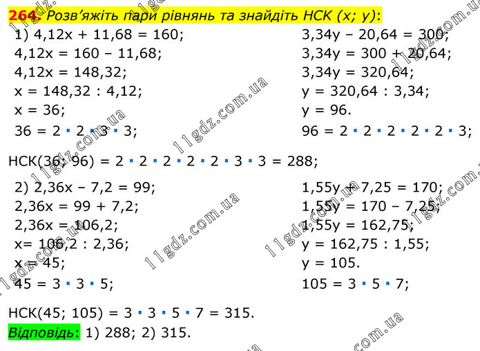 Розв’яжіть пари рівнянь та знайдіть HCK (х; у): 1) 4,12х + 11,68 = 160; 4,12х = 160 – 11,68; 4,12х = 148,32; х = 148,32 : 4,12; х = 36; 36 = 2 ∙ 2 ∙ 3 ∙ 3; 3,34у – 20,64 = 300; 3,34у = 300 + 20,64; 3,34у = 320,64; у = 320,64 : 3,34; у = 96. 96 = 2 ∙ 2 ∙ 2 ∙ 2 ∙ 2 ∙ 3; НСК(36; 96) = 2 ∙ 2 ∙ 2 ∙ 2 ∙ 2 ∙ 3 ∙ 3 = 288; 2) 2,36х – 7,2 = 99; 2,36х = 99 + 7,2; 2,36х = 106,2; х= 106,2 : 2,36; х = 45; 45 = 3 ∙ 3 ∙ 5; 1,55у + 7,25 = 170; 1,55у = 170 – 7,25; 1,55у = 162,75; у = 162,75 : 1,55; у = 105. 105 = 3 ∙ 5 ∙ 7; НСК(45; 105) = 3 ∙ 3 ∙ 5 ∙ 7 = 315. Відповідь: 1) 288; 2) 315.