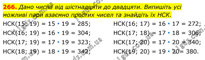 Дано числа від шістнадцяти до двадцяти. Випишіть усі можливі пари взаємно простих чисел та знайдіть їх НСК. НСК(15; 19) = 15 ∙ 19 = 285; НСК(16; 19) = 16 ∙ 19 = 304; НСК(17; 19) = 17 ∙ 19 = 323; НСК(18; 19) = 18 ∙ 19 = 342; НСК(16; 17) = 16 ∙ 17 = 272; НСК(17; 18) = 17 ∙ 18 = 306; НСК(17; 20) = 17 ∙ 20 = 340; НСК(19; 20) = 19 ∙ 20= 380.