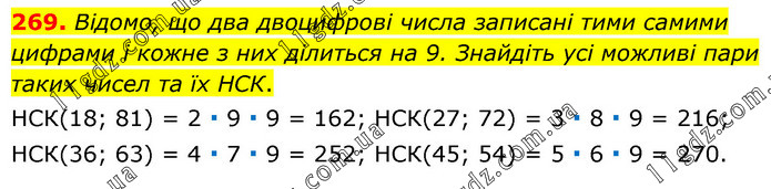 Відомо, що два двоцифрові числа записані тими самими цифрами і кожне з них ділиться на 9. Знайдіть усі можливі пари таких чисел та їх НСК. НСК(18; 81) = 2 ∙ 9 ∙ 9 = 162; НСК(27; 72) = 3 ∙ 8 ∙ 9 = 216; НСК(36; 63) = 4 ∙ 7 ∙ 9 = 252; НСК(45; 54) = 5 ∙ 6 ∙ 9 = 270.
