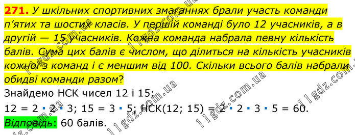 У шкільних спортивних змаганнях брали участь команди п’ятих та шостих класів. У першій команді було 12 учасників, а в другій — 15 учасників. Кожна команда набрала певну кількість балів. Сума цих балів є числом, що ділиться на кількість учасників кожної з команд і є меншим від 100. Скільки всього балів набрали обидві команди разом? Знайдемо НСК чисел 12 і 15: 12 = 2 ∙ 2 ∙ 3; 15 = 3 ∙ 5; НСК(12; 15) = 2 ∙ 2 ∙ 3 ∙ 5 = 60. Відповідь: 60 балів.