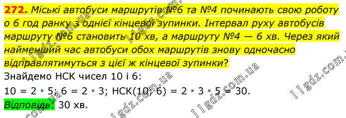 Міські автобуси маршрутів №6 та №4 починають свою роботу о 6 год ранку з однієї кінцевої зупинки. Інтервал руху автобусів маршруту №6 становить 10 хв, а маршруту №4 — 6 хв. Через який найменший час автобуси обох маршрутів знову одночасно відправлятимуться з цієї ж кінцевої зупинки? Знайдемо НСК чисел 10 і 6: 10 = 2 ∙ 5; 6 = 2 ∙ 3; НСК(10; 6) = 2 ∙ 3 ∙ 5 = 30. Відповідь: 30 хв.