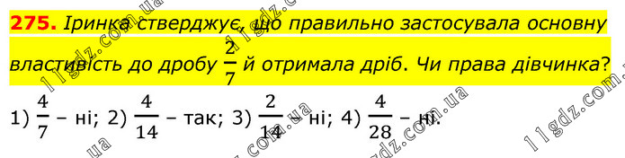 Іринка стверджує, що правильно застосувала основну властивість до дробу 2/7 й отримала дріб. Чи права дівчинка? 1) 4/7 – ні; 2) 4/14 – так; 3) 2/14 – ні; 4) 4/28 – ні.