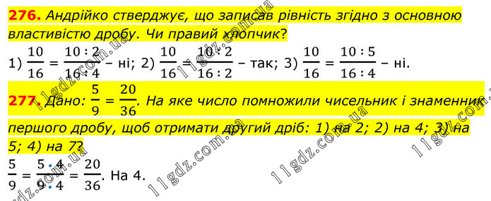 276. Андрійко стверджує, що записав рівність згідно з основною властивістю дробу. Чи правий хлопчик? 1) 10/16 = (10 ∶ 2)/(16 ∶ 4) – ні; 2) 10/16 = (10 ∶ 2)/(16 ∶ 2) – так; 3) 10/16 = (10 ∶ 5)/(16 ∶ 4) – ні. 277. Дано: 5/9 = 20/36. На яке число помножили чисельник і знаменник першого дробу, щоб отримати другий дріб: 1) на 2; 2) на 4; 3) на 5; 4) на 7? 5/9 = (5 • 4)/(9 • 4) = 20/36. На 4.