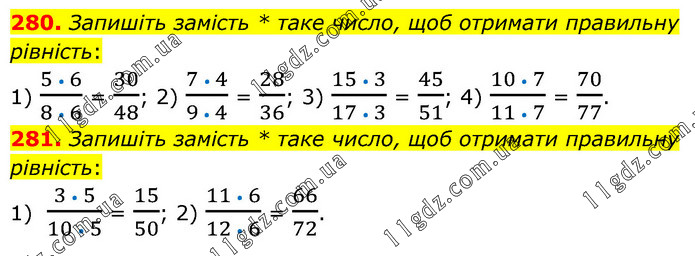 280. Запишіть замість * таке число, щоб отримати правильну рівність: 1) (5 • 6)/(8 • 6) = 30/48; 2) (7 • 4)/(9 • 4) = 28/36; 3) (15 • 3)/(17 • 3) = 45/51; 4) (10 • 7)/(11 • 7) = 70/77. 281. Запишіть замість * таке число, щоб отримати правильну рівність: 1) (3 • 5)/(10 • 5) = 15/50; 2) (11 • 6)/(12 • 6) = 66/72.