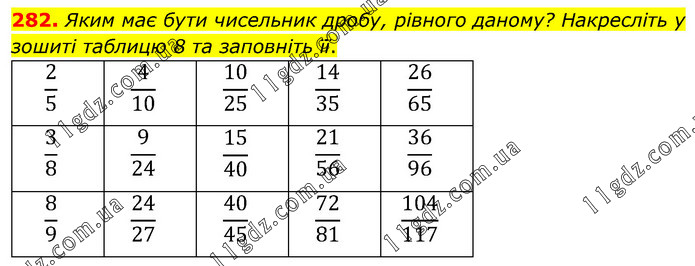 Яким має бути чисельник дробу, рівного даному? Haкресліть у зошиті таблицю 8 та заповніть її.