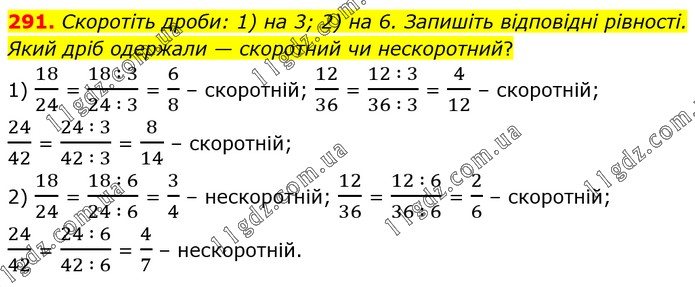 Скоротіть дроби: 1) на 3; 2) на 6. Запишіть відповідні рівності. Який дріб одержали — скоротний чи нескоротний? 1) 18/24 = (18 ∶ 3)/(24 ∶ 3) = 6/8 – скоротній; 12/36 = (12 ∶ 3)/(36 ∶ 3) = 4/12 – скоротній; 24/42 = (24 ∶ 3)/(42 ∶ 3) = 8/14 – скоротній; 2) 18/24 = (18 ∶ 6)/(24 ∶ 6) = 3/4 – нескоротній; 12/36 = (12 ∶ 6)/(36 ∶ 6) = 2/6 – скоротній; 24/42 = (24 ∶ 6)/(42 ∶ 6) = 4/7 – нескоротній.
