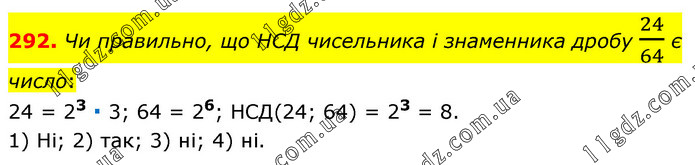 Чи правильно, що НСД чисельника і знаменника дробу 24/64 є число: 24 = 23 ∙ 3; 64 = 26; НСД(24; 64) = 23 = 8. 1) Ні; 2) так; 3) ні; 4) ні.