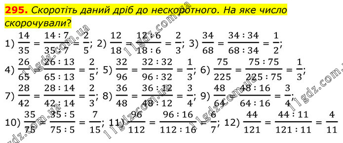 Скоротіть даний дріб до нескоротного. На яке число скорочували? 1) 14/35 = (14 ∶ 7)/(35 ∶ 7) = 2/5; 2) 12/18 = (12 ∶ 6)/(18 ∶ 6) = 2/3; 3) 34/68 = (34 ∶ 34)/(68 ∶ 34) = 1/2; 4) 26/65 = (26 ∶ 13)/(65 ∶ 13) = 2/5; 5) 32/96 = (32 ∶ 32)/(96 ∶ 32) = 1/3; 6) 75/225 = (75 ∶ 75)/(225 ∶ 75) = 1/3; 7) 28/42 = (28 ∶ 14)/(42 ∶ 14) = 2/3; 8) 36/48 = (36 ∶ 12)/(48 ∶ 12) = 3/4; 9) 48/64 = (48 ∶ 16)/(64 ∶ 16) = 3/4; 10) 35/75 = (35 ∶ 5)/(75 ∶ 5) = 7/15; 11) 96/112 = (96 ∶ 16)/(112 ∶ 16) = 6/7; 12) 44/121 = (44 ∶ 11)/(121 ∶ 11) = 4/11