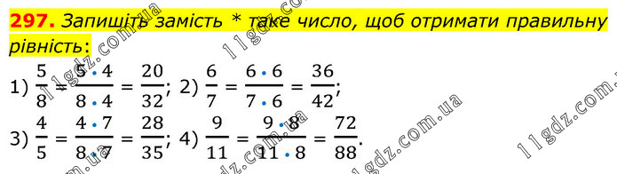 Запишіть замість * таке число, щоб отримати правильну рівність: 1) 5/8 = (5 • 4)/(8 • 4) = 20/32; 2) 6/7 = (6 • 6)/(7 • 6) = 36/42; 3) 4/5 = (4 • 7)/(8 • 7) = 28/35; 4) 9/11 = (9 • 8)/(11 • 8) = 72/88.
