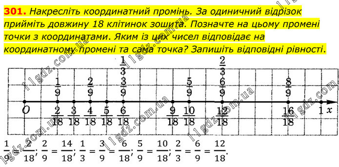 Накресліть координатний промінь. За одиничний відрізок прийміть довжину 18 клітинок зошита. Позначте на цьому промені точки з координатами. Яким із цих чисел відповідає на координатному промені та сама точка? Запишіть відповідні рівності. 1/9 = 2/18; 2/9 = 14/18; 1/3 = 3/9 = 6/18; 5/9 = 10/18; 2/3 = 6/9 = 12/18.