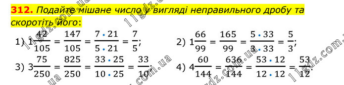 Подайте мішане число у вигляді неправильного дробу та скоротіть його: 1) 142/105 = 147/105 = (7 • 21)/(5 • 21) = 7/5; 2) 166/99 = 165/99 = (5 • 33)/(3 • 33) = 5/3; 3) 375/250 = 825/250 = (33 • 25)/(10 • 25) = 33/10; 4) 460/144 = 636/144 = (53 • 12)/(12 • 12) = 53/12.