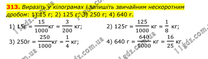 Виразіть у кілограмах і запишіть звичайним нескоротним дробом: 1) 15 г; 2) 125 г; 3) 250 г; 4) 640 г. 1) 15г = 15/1000кг = 3/200 кг; 2) 125г = 125/1000 кг = 1/8 кг; 3) 250г = 250/1000кг = 1/4 кг; 4) 640 г = 640/1000 кг = 16/25 кг.
