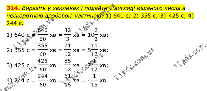Виразіть у хвилинах і подайте у вигляді мішаного числа з нескоротною дробовою частиною: 1) 640 с; 2) 355 с; 3) 425 с; 4) 244 с. 1) 640 с = 640/60 хв = 32/3 хв = 102/3 хв; 2) 355 с = 355/60 хв = 71/12 хв = 511/12 хв; 3) 425 с = 425/60 хв = 85/12 хв = 71/12 хв; 4) 244 с = 244/60 хв = 61/15 хв = 41/15 хв.