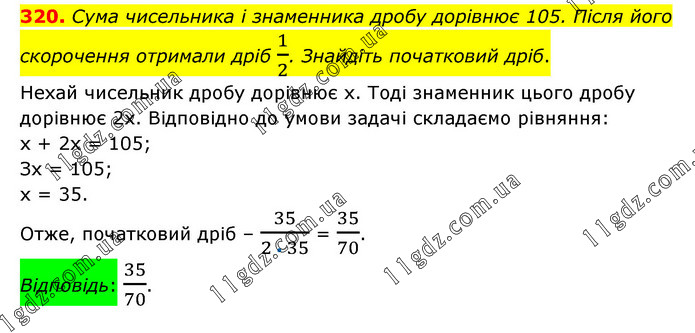 Сума чисельника і знаменника дробу дорівнює 105. Після його скорочення отримали дріб 1/2. Знайдіть початковий дріб. Нехай чисельник дробу дорівнює х. Тоді знаменник цього дробу дорівнює 2х. Відповідно до умови задачі складаємо рівняння: х + 2х = 105; Зх = 105; х = 35. Отже, початковий дріб – 35/(2 • 35) = 35/70. Відповідь: 35/70.