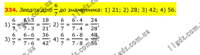 Зведіть дріб 6/7 до знаменника: 1) 21; 2) 28; 3) 42; 4) 56. 1) 6/7 = (6 • 3)/(7 • 3) = 18/21; 2) 6/7 = (6 • 4)/(7 • 4) = 24/28; 3) 6/7 = (6 • 6)/(7 • 6) = 36/42; 4) 6/7 = (6 • 8)/(7 • 8) = 48/56.