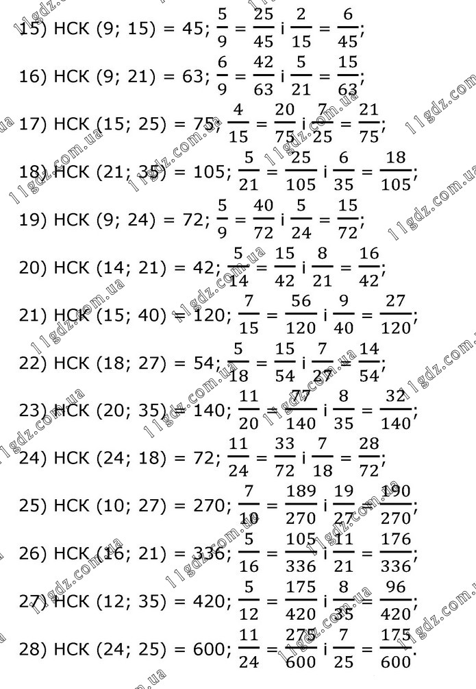 15) НСК (9; 15) = 45; 5/9 = 25/45 і 2/15 = 6/45; 16) НСК (9; 21) = 63; 6/9 = 42/63 і 5/21 = 15/63; 17) НСК (15; 25) = 75; 4/15 = 20/75 і 7/25 = 21/75; 18) НСК (21; 35) = 105; 5/21 = 25/105 і 6/35 = 18/105; 19) НСК (9; 24) = 72; 5/9 = 40/72 і 5/24 = 15/72; 20) НСК (14; 21) = 42; 5/14 = 15/42 і 8/21 = 16/42; 21) НСК (15; 40) = 120; 7/15 = 56/120 і 9/40 = 27/120; 22) НСК (18; 27) = 54; 5/18 = 15/54 і 7/27 = 14/54; 23) НСК (20; 35) = 140; 11/20 = 77/140 і 8/35 = 32/140; 24) НСК (24; 18) = 72; 11/24 = 33/72 і 7/18 = 28/72; 25) НСК (10; 27) = 270; 7/10 = 189/270 і 19/27 = 190/270; 26) НСК (16; 21) = 336; 5/16 = 105/336 і 11/21 = 176/336; 27) НСК (12; 35) = 420; 5/12 = 175/420 і 8/35 = 96/420; 28) НСК (24; 25) = 600; 11/24 = 275/600 і 7/25 = 175/600.