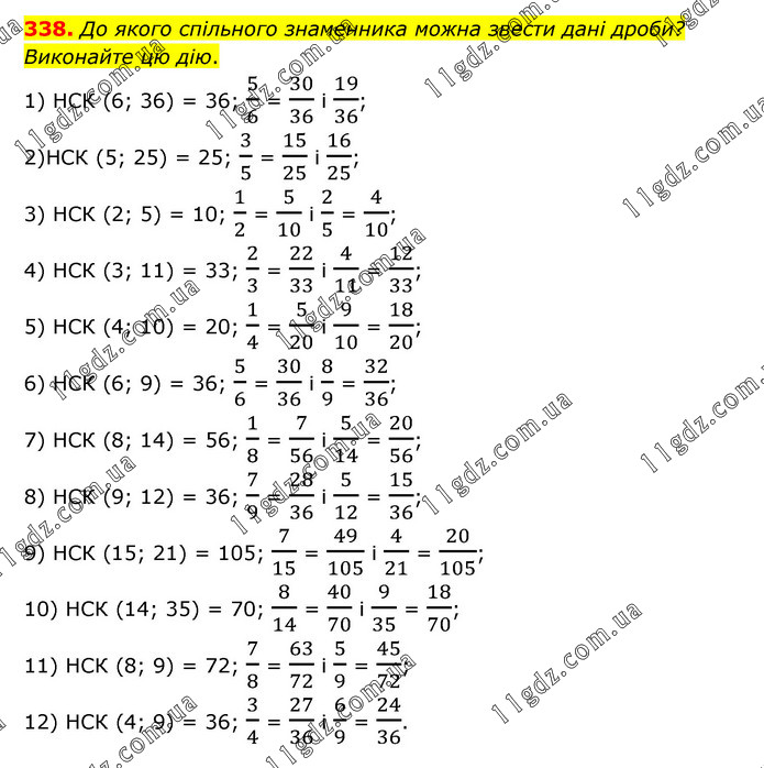 До якого спільного знаменника можна звести дані дроби? Виконайте цю дію. 1) НСК (6; 36) = 36; 5/6 = 30/36 і 19/36; 2) НСК (5; 25) = 25; 3/5 = 15/25 і 16/25; 3) НСК (2; 5) = 10; 1/2 = 5/10 і 2/5 = 4/10; 4) НСК (3; 11) = 33; 2/3 = 22/33 і 4/11 = 12/33; 5) НСК (4; 10) = 20; 1/4 = 5/20 і 9/10 = 18/20; 6) НСК (6; 9) = 36; 5/6 = 30/36 і 8/9 = 32/36; 7) НСК (8; 14) = 56; 1/8 = 7/56 і 5/14 = 20/56; 8) НСК (9; 12) = 36; 7/9 = 28/36 і 5/12 = 15/36; 9) НСК (15; 21) = 105; 7/15 = 49/105 і 4/21 = 20/105; 10) НСК (14; 35) = 70; 8/14 = 40/70 і 9/35 = 18/70; 11) НСК (8; 9) = 72; 7/8 = 63/72 і 5/9 = 45/72; 12) НСК (4; 9) = 36; 3/4 = 27/36 і 6/9 = 24/36.