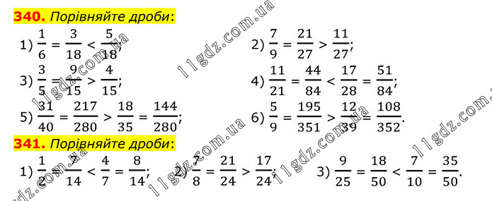 340. Порівняйте дроби: 1) 1/6 = 3/18 < 5/18; 2) 7/9 = 21/27 > 11/27; 3) 3/5 = 9/15 > 4/15; 4) 11/21 = 44/84 < 17/28 = 51/84; 5) 31/40 = 217/280 > 18/35 = 144/280; 6) 5/9 = 195/351 > 12/39 = 108/352. 341. Порівняйте дроби: 1) 1/2 = 7/14 < 4/7 = 8/14; 2) 7/8 = 21/24 > 17/24; 3) 9/25 = 18/50 < 7/10 = 35/50.