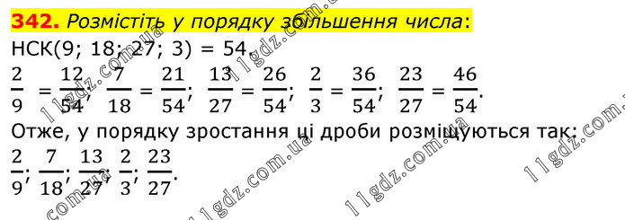 Розмістіть у порядку збільшення числа: НСК(9; 18; 27; 3) = 54. 2/9 = 12/54; 7/18 = 21/54; 13/27 = 26/54; 2/3 = 36/54; 23/27 = 46/54. Отже, у порядку зростання ці дроби розміщуються так: 2/9; 7/18; 13/27; 2/3; 23/27.