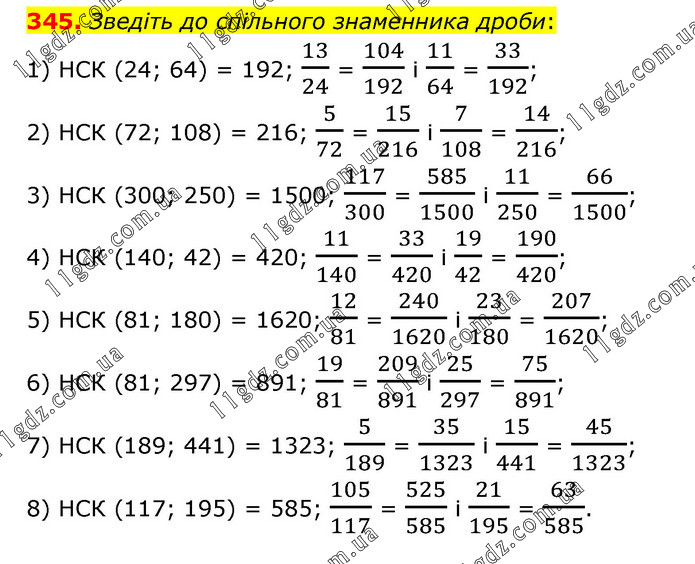 Зведіть до спільного знаменника дроби: 1) НСК (24; 64) = 192; 13/24 = 104/192 і 11/64 = 33/192; 2) НСК (72; 108) = 216; 5/72 = 15/216 і 7/108 = 14/216; 3) НСК (300; 250) = 1500; 117/300 = 585/1500 і 11/250 = 66/1500; 4) НСК (140; 42) = 420; 11/140 = 33/420 і 19/42 = 190/420; 5) НСК (81; 180) = 1620; 12/81 = 240/1620 і 23/180 = 207/1620; 6) НСК (81; 297) = 891; 19/81 = 209/891 і 25/297 = 75/891; 7) НСК (189; 441) = 1323; 5/189 = 35/1323 і 15/441 = 45/1323; 8) НСК (117; 195) = 585; 105/117 = 525/585 і 21/195 = 63/585.