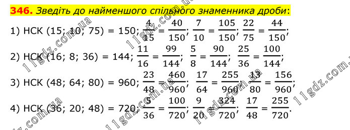 Зведіть до найменшого спільного знаменника дроби: 1) НСК (15; 10; 75) = 150; 4/15 = 40/150; 7/10 = 105/150; 22/75 = 44/150; 2) НСК (16; 8; 36) = 144; 11/16 = 99/144; 5/8 = 90/144; 25/36 = 100/144; 3) НСК (48; 64; 80) = 960; 23/48 = 460/960; 17/64 = 255/960; 13/80 = 156/960; 4) НСК (36; 20; 48) = 720; 5/36 = 100/720; 9/20 = 324/720; 17/48 = 255/720.