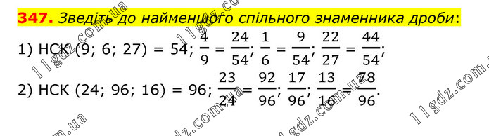 Зведіть до найменшого спільного знаменника дроби: 1) НСК (9; 6; 27) = 54; 4/9 = 24/54; 1/6 = 9/54; 22/27 = 44/54; 2) НСК (24; 96; 16) = 96; 23/24 = 92/96; 17/96; 13/16 = 78/96.