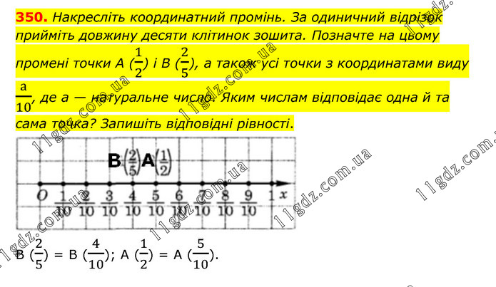 Накресліть координатний промінь. За одиничний відрізок прийміть довжину десяти клітинок зошита. Позначте на цьому промені точки А (1/2) і В (2/5), а також усі точки з координатами виду а/10, де а — натуральне число. Яким числам відповідає одна й та сама точка? Запишіть відповідні рівності. В (2/5) = В (4/10); А (1/2) = А (5/10).