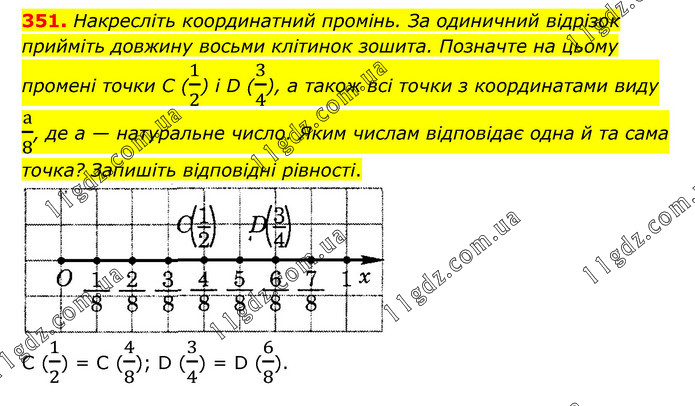 Накресліть координатний промінь. За одиничний відрізок прийміть довжину восьми клітинок зошита. Позначте на цьому промені точки С (1/2) і D (3/4), а також всі точки з координатами виду а/8, де а — натуральне число. Яким числам відповідає одна й та сама точка? Запишіть відповідні рівності. С (1/2) = С (4/8); D (3/4) = D (6/8).