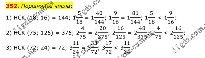 Порівняйте числа: 1) НСК (18; 16) = 144; 15/18 = 140/144; 19/16 = 181/144; 15/18 < 19/16; 2) НСК (75; 125) = 375; 24/75 = 220/375; 216/125 = 248/375; 24/75 < 216/125; 3) НСК (72; 24) = 72; 311/24 = 333/72; 317/72 < 311/24.
