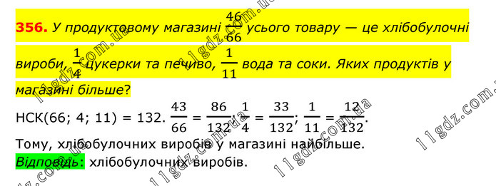 У продуктовому магазині 46/66 усього товару — це хлібобулочні вироби, 1/4 цукерки та печиво, 1/11 вода та соки. Яких продуктів у магазині більше? НСК(66; 4; 11) = 132. 43/66 = 86/132; 1/4 = 33/132; 1/11 = 12/132. Тому, хлібобулочних виробів у магазині найбільше. Відповідь: хлібобулочних виробів.