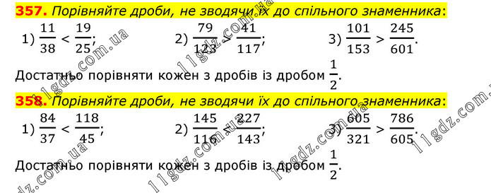 357. Порівняйте дроби, не зводячи їх до спільного знаменника: 1) 11/38 < 19/25; 2) 79/123 > 41/117; 3) 101/153 > 245/601. Достатньо порівняти кожен з дробів із дробом 1/2. 358. Порівняйте дроби, не зводячи їх до спільного знаменника: 1) 84/37 < 118/45; 2) 145/116 < 227/143; 3) 605/321 > 786/605. Достатньо порівняти кожен з дробів із дробом 1/2.