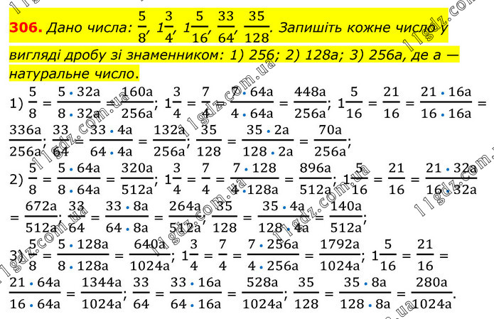 Дано числа: 5/8, 13/4, 15/16, 33/64, 35/128. Запишіть кожне число у вигляді дробу зі знаменником: 1) 256; 2) 128а; 3) 256а, де а — натуральне число. 1) 5/8 = (5 • 32а)/(8 • 32а) = 160а/256а; 13/4 = 7/4 = (7 • 64а)/(4 • 64а) = 448а/256а; 15/16 = 21/16 = (21 • 16а)/(16 • 16а) = 336а/256а; 33/64 = (33 • 4а)/(64 • 4а) = 132а/256а; 35/128 = (35 • 2а)/(128 • 2а) = 70а/256а; 2) 5/8 = (5 • 64а)/(8 • 64а) = 320а/512а; 13/4 = 7/4 = (7 • 128)/(4 •128а) = 896а/512а; 15/16 = 21/16 = (21 • 32а)/(16 • 32а) = 672а/512а; 33/64 = (33 • 8а)/(64 • 8а) = 264а/512а; 35/128 = (35 • 4а)/(128 • 4а) = 140а/512а; 3) 5/8 = (5 • 128а)/(8 • 128а) = 640а/1024а; 13/4 = 7/4 = (7 • 256а)/(4 • 256а) = 1792а/1024а; 15/16 = 21/16 = (21 • 64а)/(16 • 64а) = 1344а/1024а; 33/64 = (33 • 16а)/(64 • 16а) = 528а/1024а; 35/128 = (35 • 8а)/(128 • 8а) = 280а/1024а.