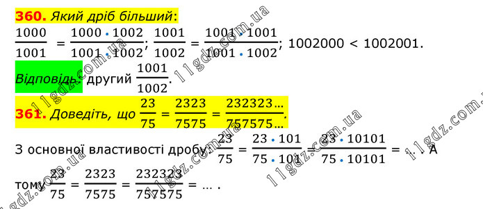 360. Який дріб більший: 1000/1001 = (1000 • 1002)/(1001 • 1002); 1001/1002 = (1001 • 1001)/(1001 • 1002); 1002000 < 1002001. Відповідь: другий 1001/1002. 361. Доведіть, що 23/75 = 2323/7575 = (232323…)/(757575…). З основної властивості дробу: 23/75 = (23 • 101)/(75 • 101) = (23 • 10101)/(75 • 10101) = … . А тому 23/75 = 2323/7575 = 232323/757575 = … .
