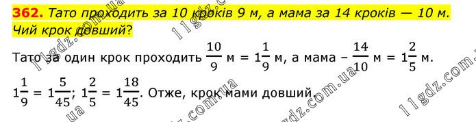 Тато проходить за 10 кроків 9 м, а мама за 14 кроків — 10 м. Чий крок довший? Тато за один крок проходить 10/9 м = 11/9 м, а мама – 14/10 м = 12/5 м. 11/9 = 15/45; 12/5 = 118/45. Отже, крок мами довший.