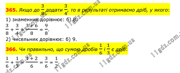 365. Якщо до 3/8 додати 3/4, то в результаті отримаємо дріб, у якого: 1) знаменник дорівнює: б) 8; 3/8 + 3/4 = (3 + 6)/8 = 9/8. 2) чисельник дорівнює: б) 9. 366. Чи правильно, що сумою дробів 1/6 і 1/3 є дріб: 1/6 + 1/3 = (1 + 2)/6 = 3/6 = 1/2.