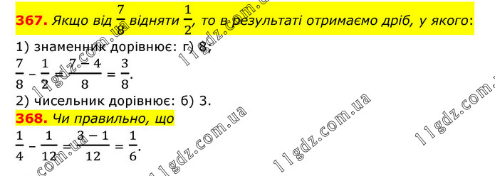 367. Якщо від 7/8 відняти 1/2, то в результаті отримаємо дріб, у якого: 1) знаменник дорівнює: г) 8; 7/8 – 1/2 = (7 - 4)/8 = 3/8. 2) чисельник дорівнює: б) 3. 368. Чи правильно, що 1/4 – 1/12 = (3 - 1)/12 = 1/6.