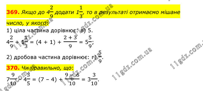 369. Якщо до 42/9 додати 11/3, то в результаті отримаємо мішане число, у якого: 1) ціла частина дорівнює: в) 5. 42/9 + 11/3 = (4 + 1) + (2 + 3)/9 = 55/9; 2) дробова частина дорівнює: г) 5/9. 370. Чи правильно, що: 79/10 – 43/5 = (7 – 4) + (9 - 6)/10 = 33/10.