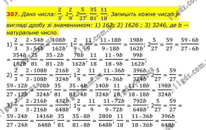 Дано числа: 2/3, 12/9, 25/27, 35/81, 11/18. Запишіть кожне число у вигляді дробу зі знаменником: 1) 162; 2) 1626 ; 3) 3246, де b — натуральне число. 1) 2/3 = (2 • 54b)/(3 • 54b) = 108b/162b; 12/9 = 11/9 = (11 • 18b)/(9 • 18b) = 198b/162b; 25/27 = 59/27 = (59 • 6b)/(27 • 6b) = 354b/162b; 35/81 = (35 • 2b)/(81 • 2b) = 70b/162b; 11/18 = (11 • 9b)/(18 • 9b) = 99b/162b; 2) 2/3 = (2 • 108b)/(3 • 108b) = 216b/324b; 12/9 = 11/9 = (11 • 36b)/(9 • 36b) = 396b/324b; 25/27 = 59/27 = (59 • 12b)/(27 • 12b) = 708b/324b; 35/81 = (35 • 4b)/(81 • 4b) = 140b/324b; 11/18 = (11 • 18b)/(18 • 18b) = 198b/324b; 3) 2/3 = (2 • 216b)/(3 • 216b) = 432b/648b; 12/9 = 11/9 = (11 • 72b)/(9 • 72b) = 792b/648b; 25/27 = 59/27 = (59 • 24b)/(27 • 24b) = 1416b/648b; 35/81 = (35 • 8b)/(81 • 8b) = 280b/648b; 11/18 = (11 • 36b)/(18 • 36b) = 396b/648b.