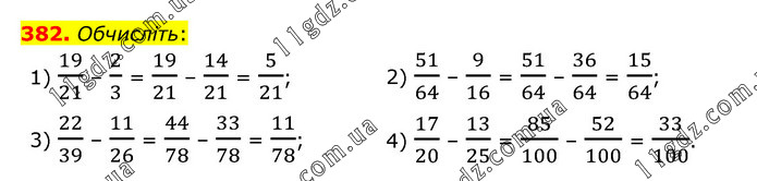 Обчисліть: 1) 19/21 – 2/3 = 19/21 – 14/21 = 5/21; 2) 51/64 – 9/16 = 51/64 – 36/64 = 15/64; 3) 22/39 – 11/26 = 44/78 – 33/78 = 11/78; 4) 17/20 – 13/25 = 85/100 – 52/100 = 33/100.