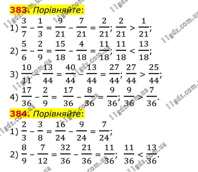 383. Порівняйте: 1) 3/7 – 1/3 = 9/21 – 7/21 = 2/21; 2/21 > 1/21; 2) 5/6 – 2/9 = 15/18 – 4/18 = 11/18; 11/18 < 13/18; 3) 10/11 – 13/44 = 40/44 – 13/44 = 27/44; 27/44 > 25/44; 4) 17/36 – 2/9 = 17/36 – 8/36 = 9/36; 9/36 > 7/36. 384. Порівняйте: 1) 2/3 – 3/8 = 16/24 – 9/24 = 7/24; 2) 8/9 – 7/12 = 32/36 – 21/36 = 11/36; 11/36 < 13/36.