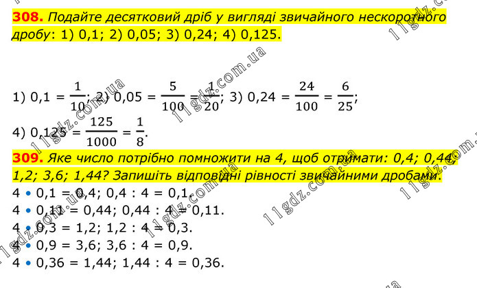 308. Подайте десятковий дріб у вигляді звичайного нескоротного дробу: 1) 0,1; 2) 0,05; 3) 0,24; 4) 0,125. 1) 0,1 = 1/10; 2) 0,05 = 5/100 = 1/20; 3) 0,24 = 24/100 = 6/25; 4) 0,125 = 125/1000 = 1/8. 309. Яке число потрібно помножити на 4, щоб отримати: 0,4; 0,44; 1,2; 3,6; 1,44? Запишіть відповідні рівності звичайними дробами. 4 • 0,1 = 0,4; 0,4 : 4 = 0,1. 4 • 0,11 = 0,44; 0,44 : 4 = 0,11. 4 • 0,3 = 1,2; 1,2 : 4 = 0,3. 4 • 0,9 = 3,6; 3,6 : 4 = 0,9. 4 • 0,36 = 1,44; 1,44 : 4 = 0,36.