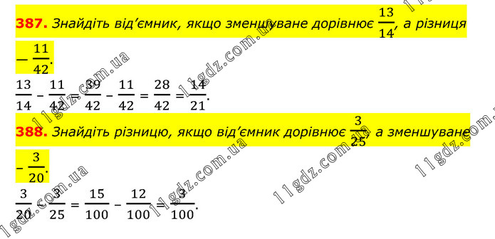 387. Знайдіть від’ємник, якщо зменшуване дорівнює 13/14, а різниця — 11/42. 13/14 – 11/42 = 39/42 – 11/42 = 28/42 = 14/21. 388. Знайдіть різницю, якщо від’ємник дорівнює 3/25, а зменшуване – 3/20. 3/20 – 3/25 = 15/100 – 12/100 = 3/100.